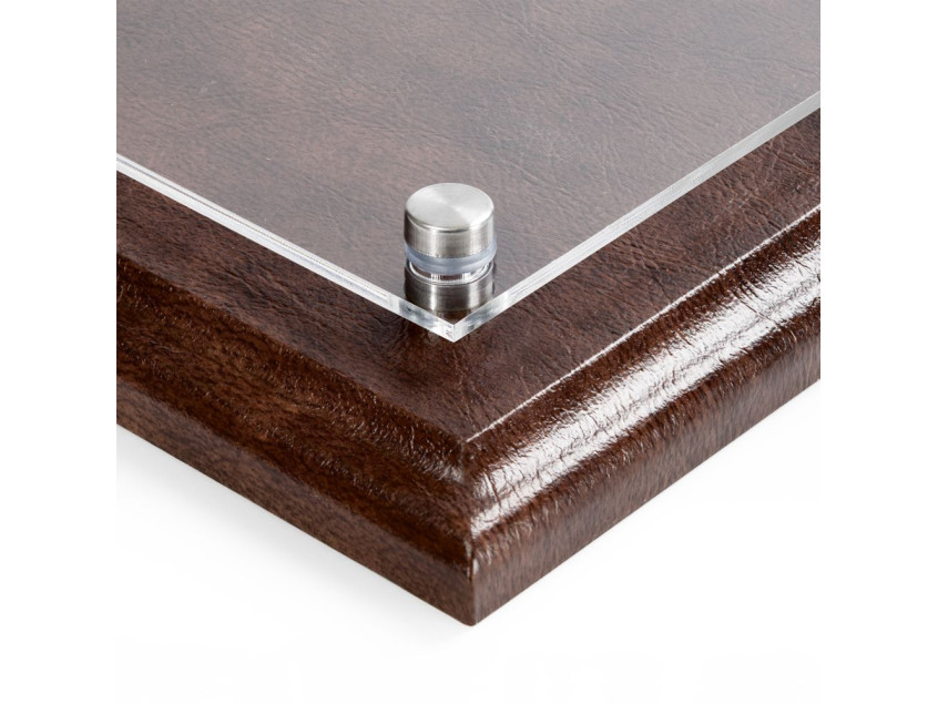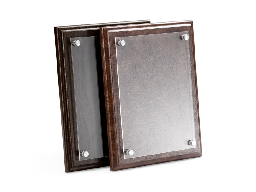 Классическая плакетка с имитирующей кожаную текстуру основой и акриловой вставкой — универсальный инструмент, чтобы рассказать о достижениях команды.