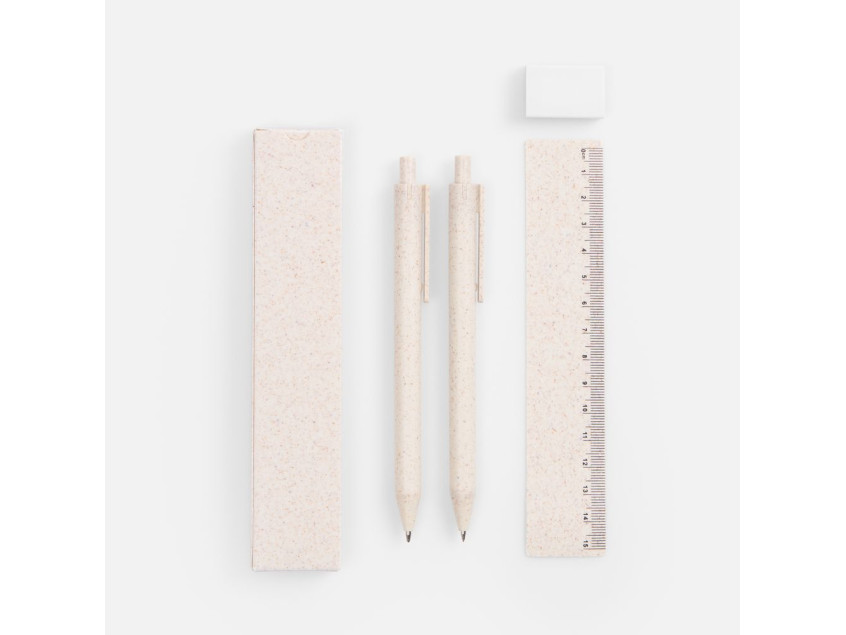 - В комплекте ручка, механический карандаш, линейка, ластик и упаковка.