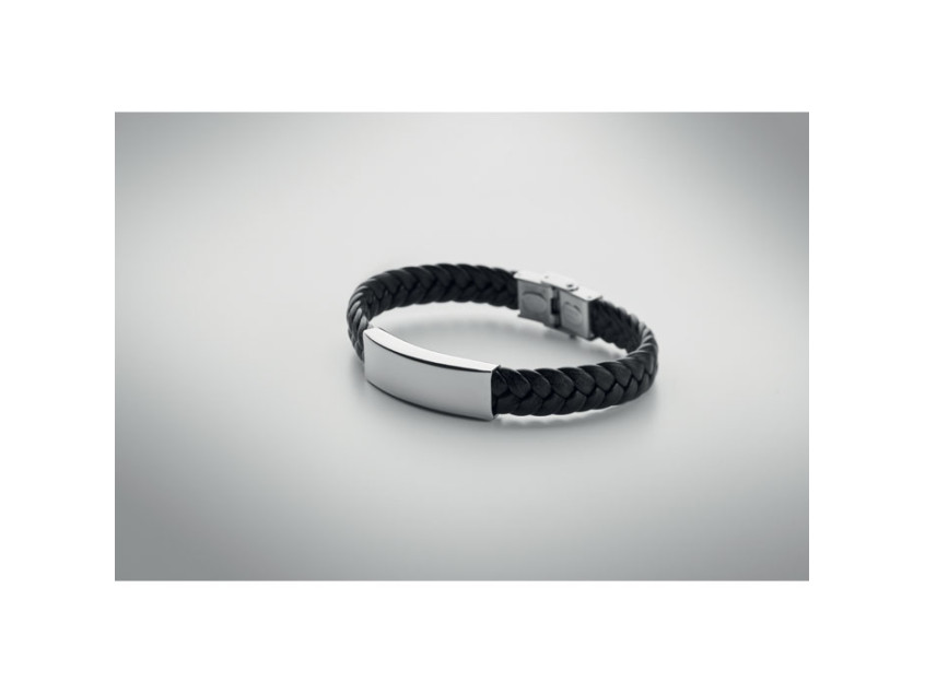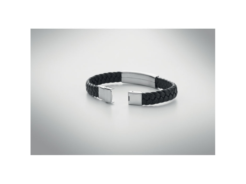 Плетеный браслет из искусственной кожи с фурнитурой из полированной стали. Застежка-защелка. Обхват запястья: 21 см.
