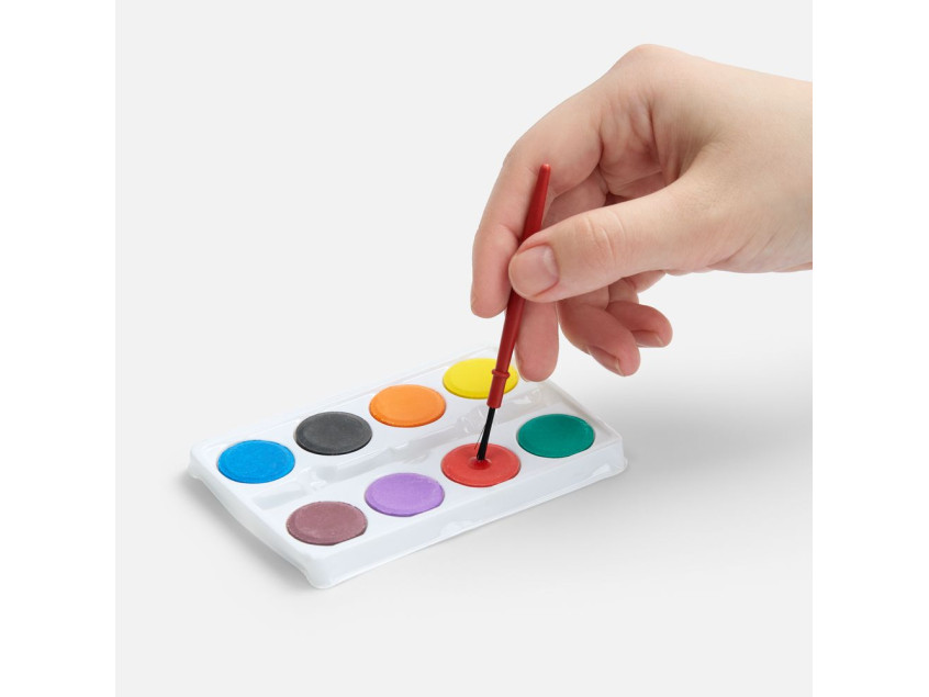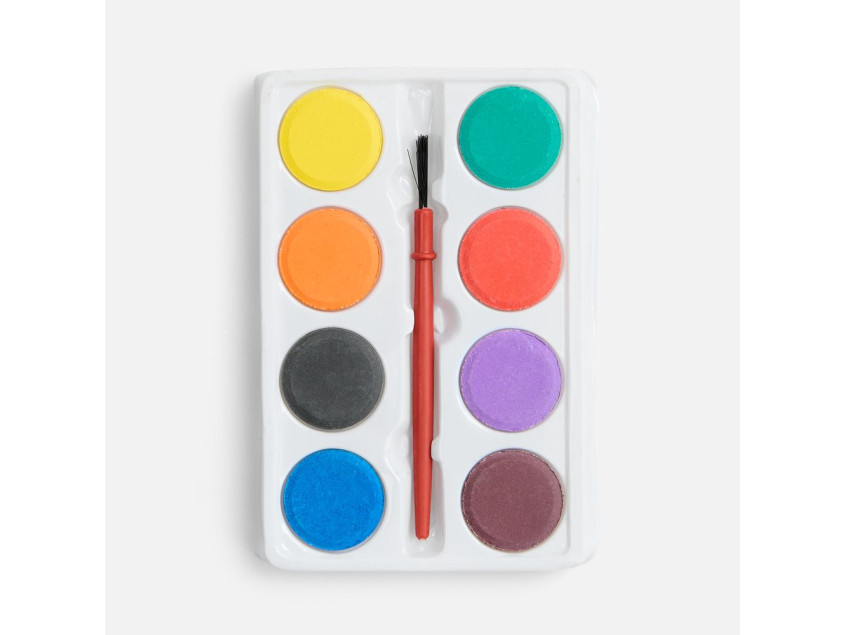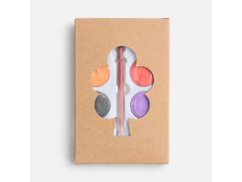 Набор из 8 акварельных красок и кисточки в коробке из крафт-бумаги.