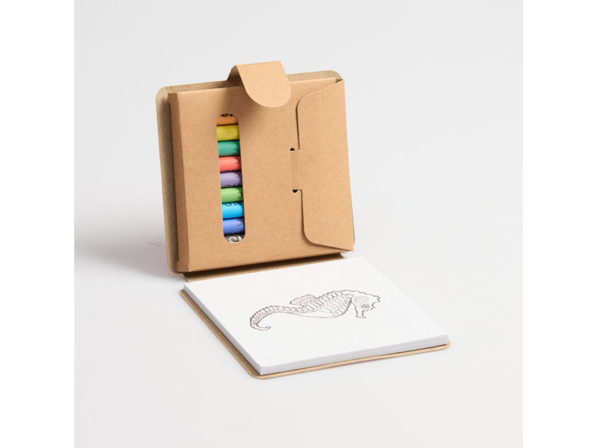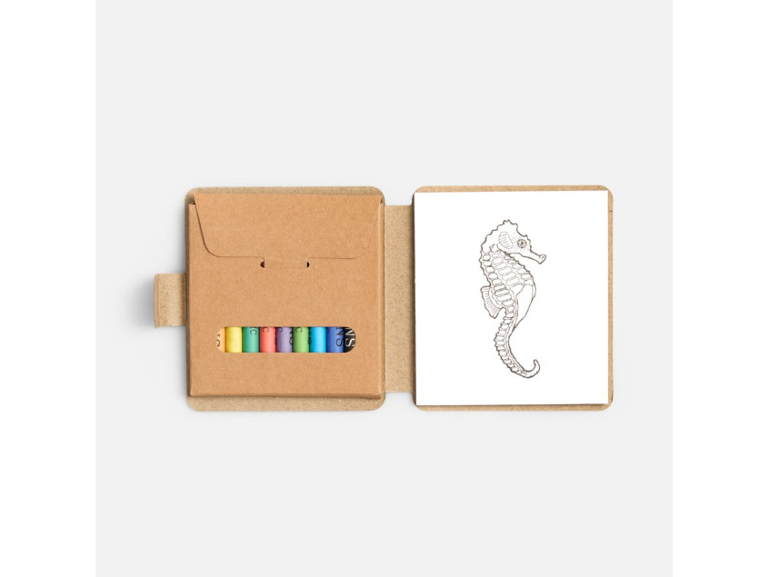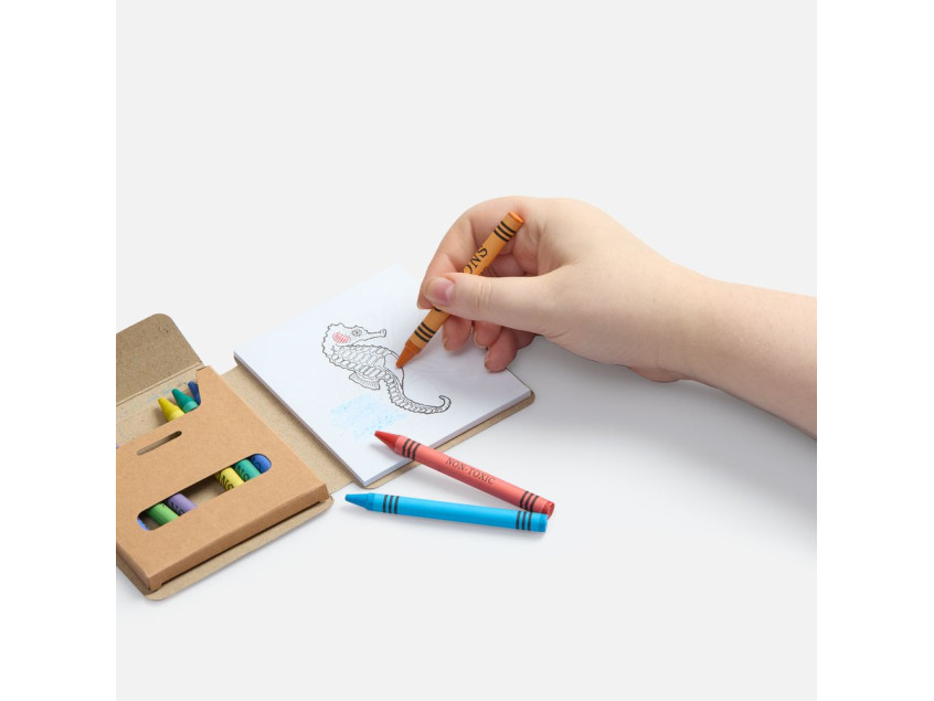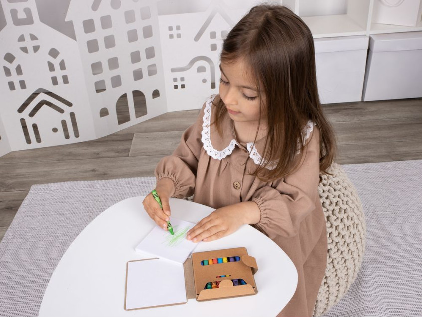 В комплекте 10 цветных восковых мелков и блокнот на 40 страниц для раскрашивания и рисования: 12 страниц с рисунками и 28 чистых страниц. Блокнот и мелки компактно хранятся под одной обложкой.