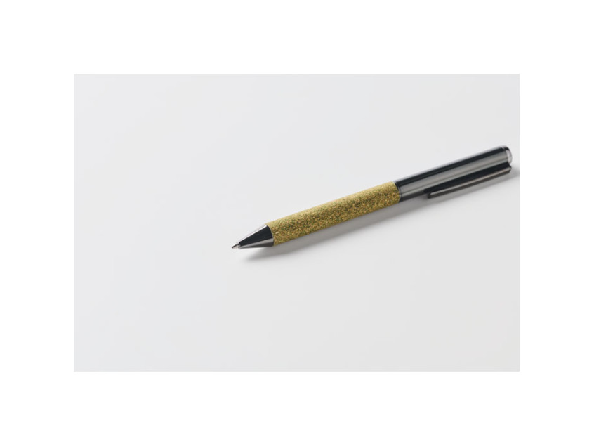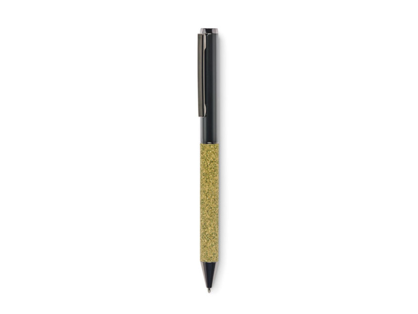 Twist metal ballpen with fabric on barrel made of 20% tea grounds, 30% cork, 50% polycotton cloth in carton box. Blue ink.