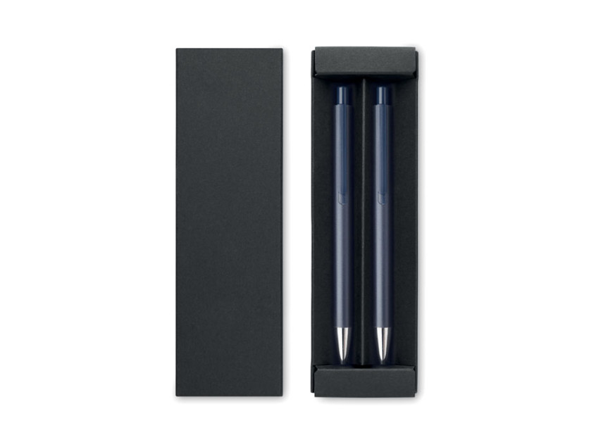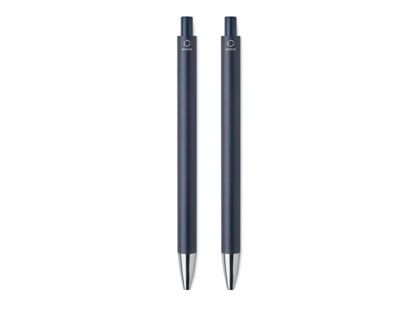 Письменный набор, включающий шариковую ручку из переработанного алюминия (синие чернила) и вечный карандаш. Поставляется в коробке из переработанной бумаги.