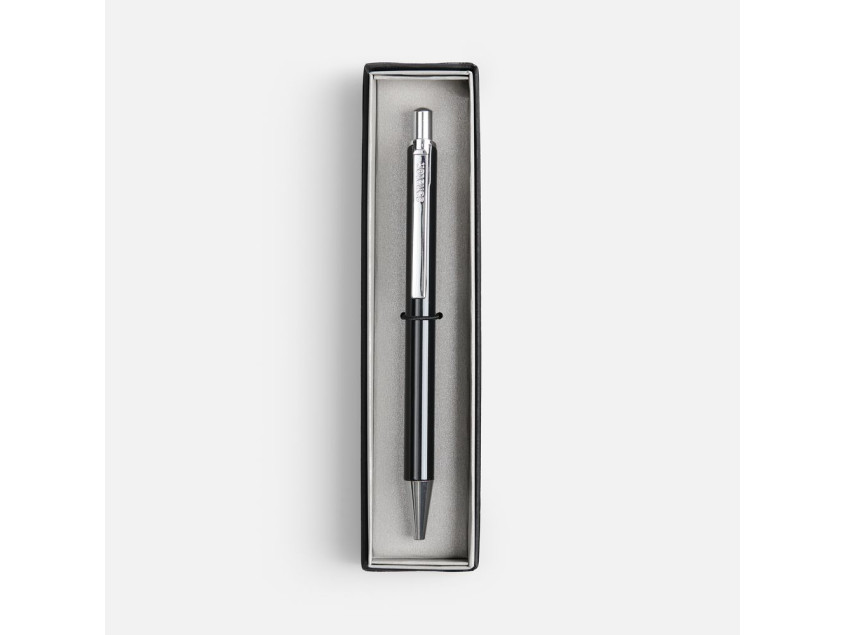 Шариковая ручка в лакированном корпусе с хромированными деталями. Футляр из дизайнерской бумаги с контрастным коробом придает подарку законченный и элегантный вид.