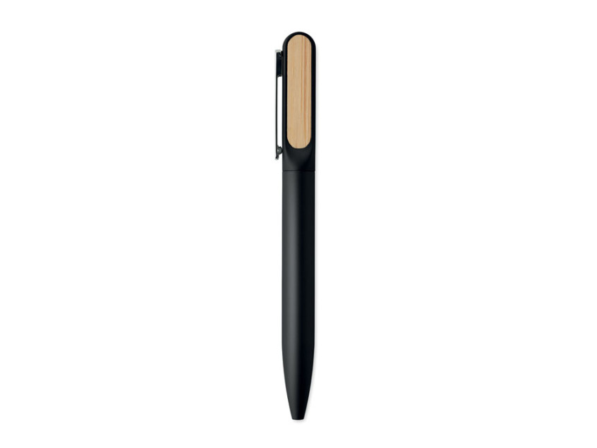 Шариковая ручка с поворотным механизмом, корпусом из переработанного алюминия, поворотной частью из переработанного пластика и металлическим зажимом с бамбуковыми деталями. Синие чернила.