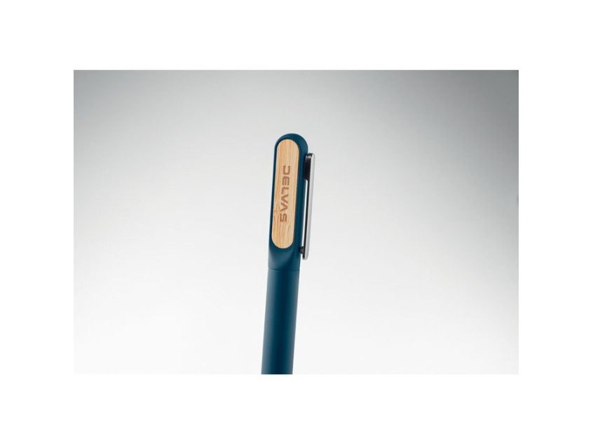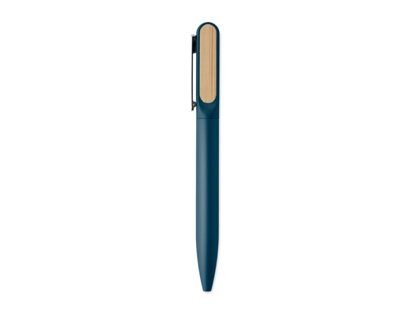 Шариковая ручка с поворотным механизмом, корпусом из переработанного алюминия, поворотной частью из переработанного пластика и металлическим зажимом с бамбуковыми деталями. Синие чернила.