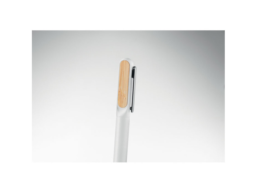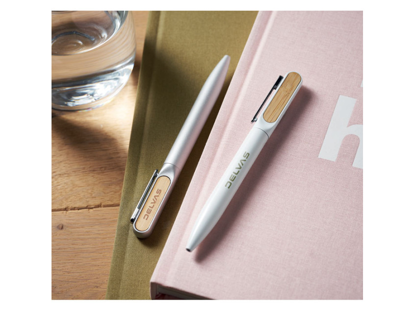 Шариковая ручка с поворотным механизмом, корпусом из переработанного алюминия, поворотной частью из переработанного пластика и металлическим зажимом с бамбуковыми деталями. Синие чернила.