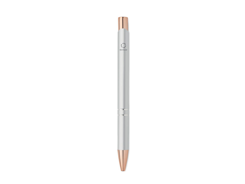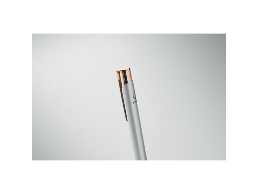 Кнопочная шариковая ручка из переработанного алюминия с деталями из розового золота. Синие чернила.