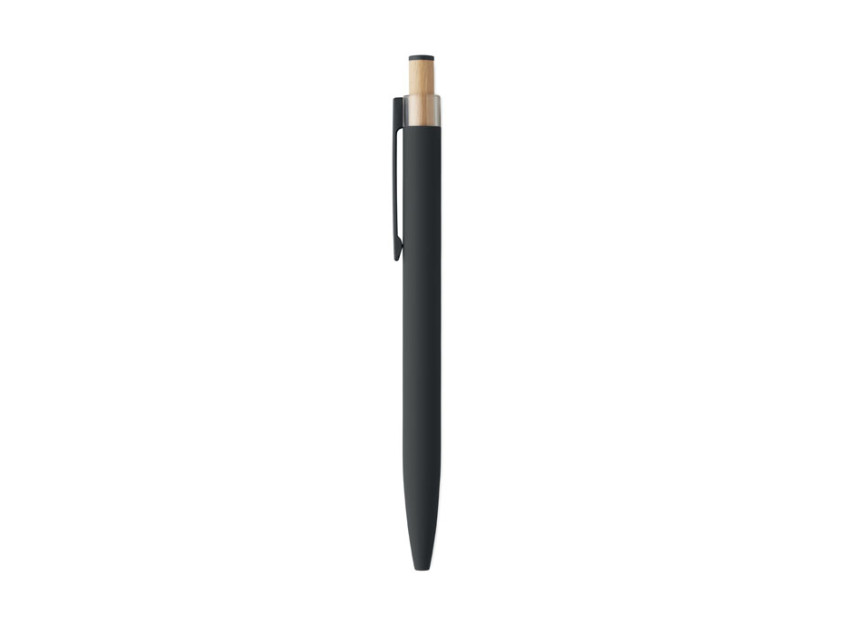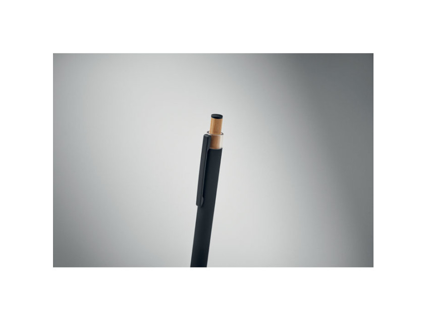 Recycled aluminium push ball pen with bamboo button with matching colour detail and matching metal clip. Blue ink.