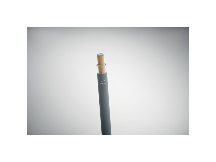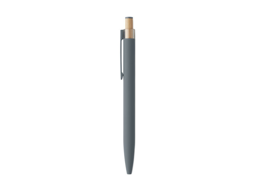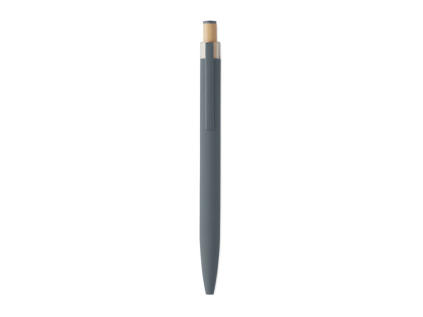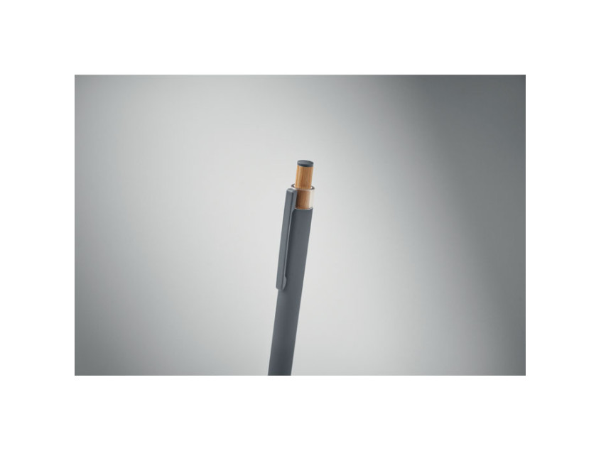 Recycled aluminium push ball pen with bamboo button with matching colour detail and matching metal clip. Blue ink.