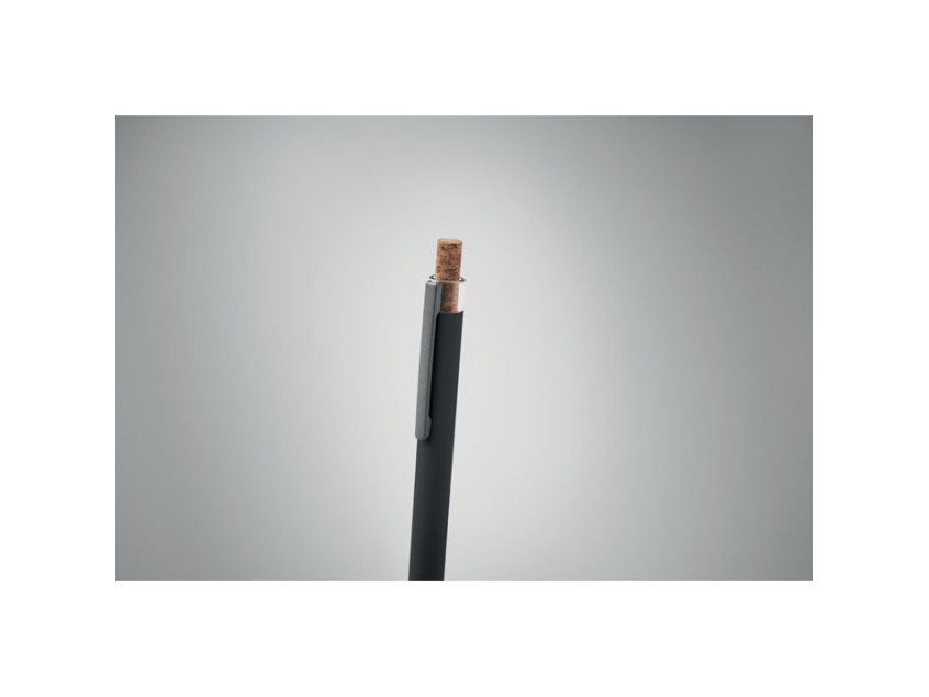 Push ball pen in recycled aluminium with cork detail button and metal clip. Blue ink.