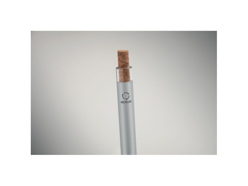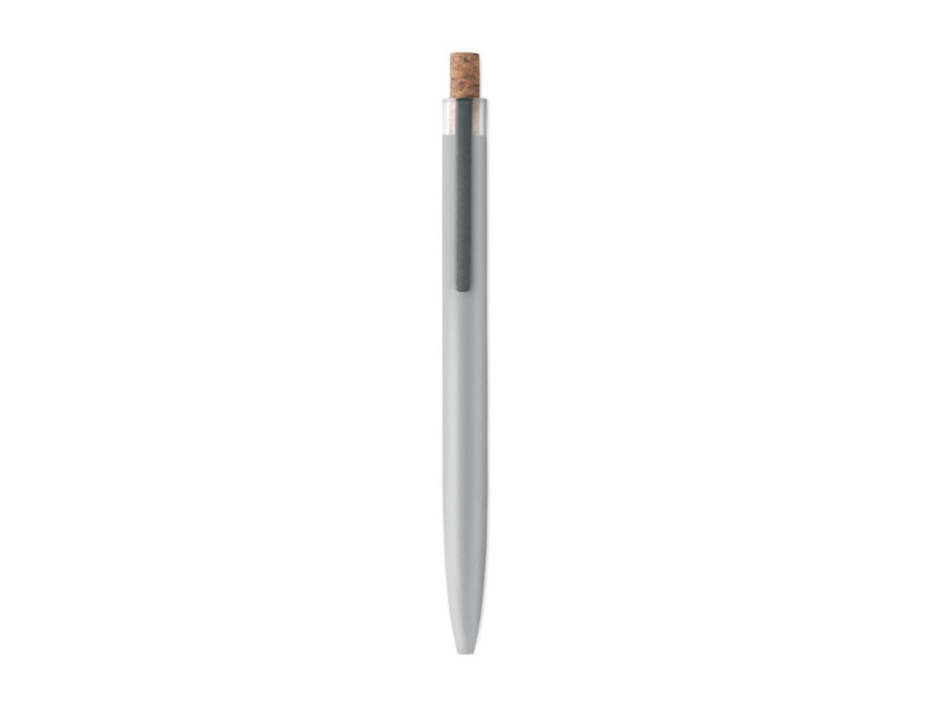 Push ball pen in recycled aluminium with cork detail button and metal clip. Blue ink.