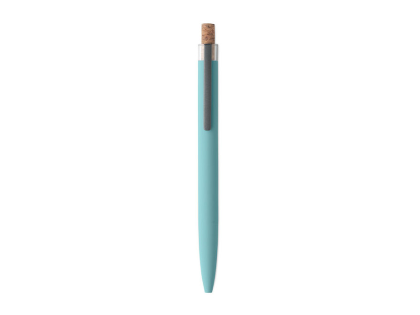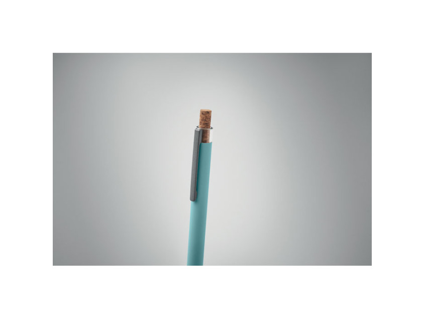 Push ball pen in recycled aluminium with cork detail button and metal clip. Blue ink.