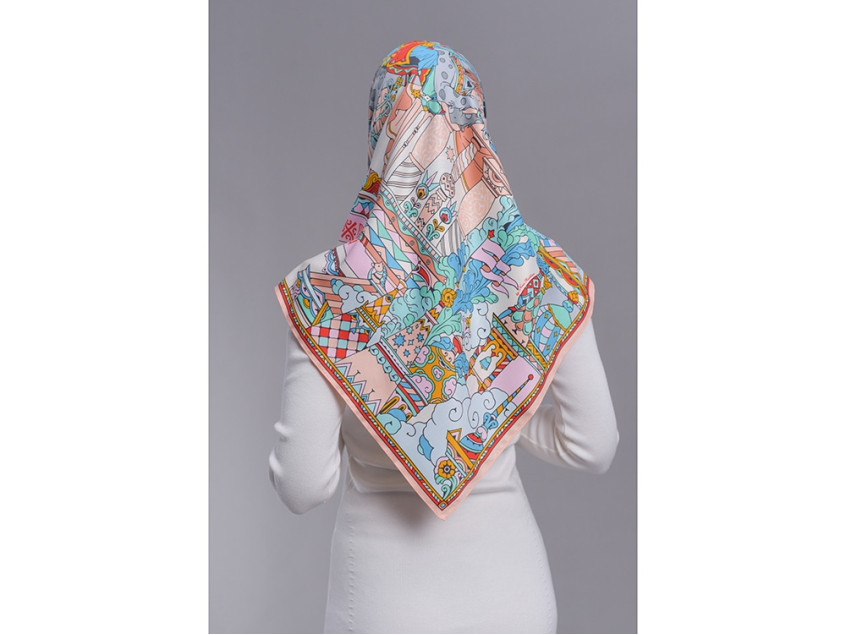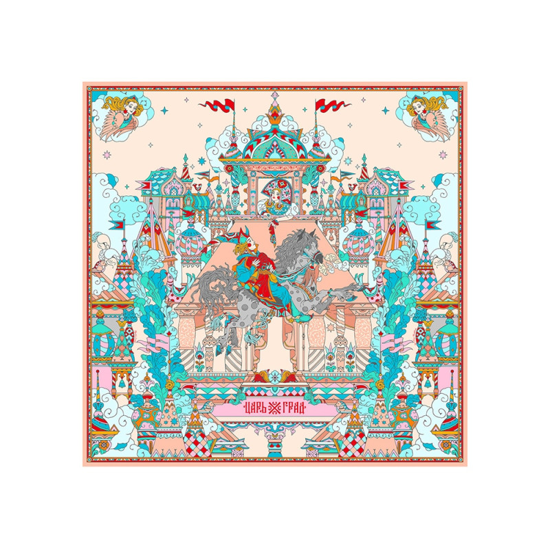Платок Царьград создан в партнерстве с одноименным загородным курортом, где чтут лучшие обычаи русского гостеприимства. Дизайн платка обращен к воплощению народной традиции чародейства и сказки. Сюжет иллюстрирует фольклорную сцену из произведения Сивка-Бурка о победе истинного чувства и исполнении желаний. Перед нами возвышается волшебный терем Царьграда с разноцветными башнями, расписными столпами, диковинными растениями. Иван, преодолев все испытания, на резвом коне устремлен к прекрасной царевне. Все в Царьграде наполнено атмосферой радости и праздника для свершения чудес! Платок выполнен с любовью в русском стиле. Царьград отличают яркий колорит, тонкая художественная работа и настроение настоящей сказки! Над дизайном работали: Нина Ручкина, Мила Лосенко.