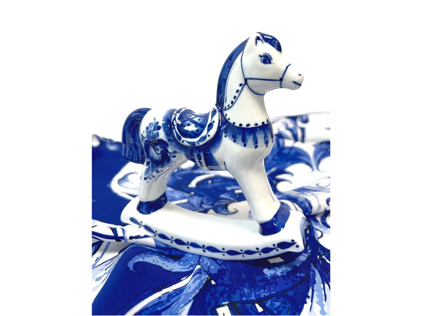 Гжель — популярный художественный промысел, символ России — яркая, самобытная и неповторимая. Платок Гжель от бренда Русские в моде выполнен в технике знаменитой кобальтовой росписи. Узоры в тонких оттенках синего цвета, размещенные на белом фоне, — один из самых распространенных рисунков гжель, чья форма столетиями доводилась мастерами до совершенства. На полотне восхитительные соцветия тугих бутонов и ажурных лепестков гармонично соседствуют с узнаваемыми сине-голубыми завитками, спиралями и линиями. Статуэтка Лошадка-качалка создана Объединением Гжель — всемирно известной фабрикой фарфора, который отличается качеством, долговечностью и красотой. Изысканное изделия Лошадка-качалка напомнит о волшебном мире детства, домашнем уюте и радости каждого дня. Фигурка выполнена из фарфора с ручной сине-белой росписью и воплощает неповторимое искусство гжели. Дуэт Гжель непременно принесет Вам исполнение всех заветных желаний и счастье!