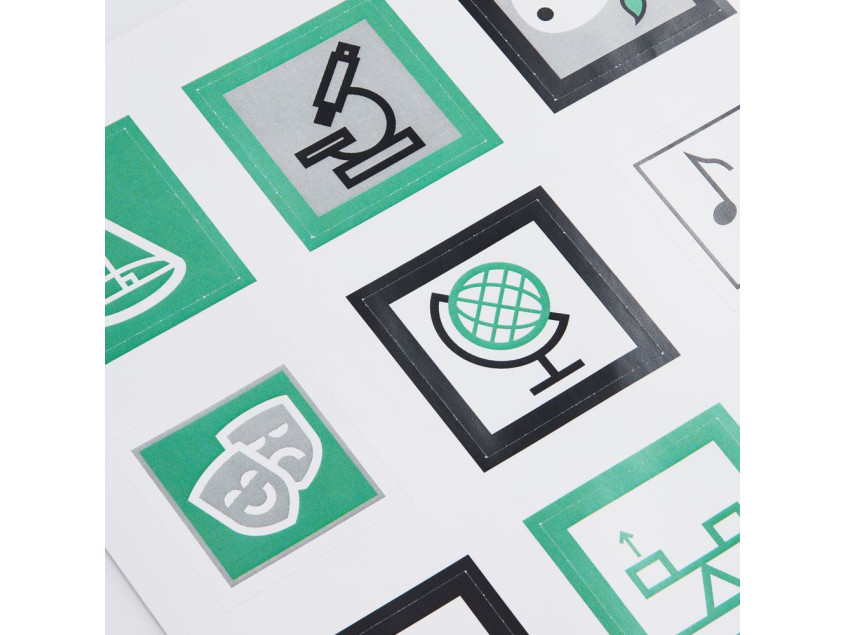 В каждой части общего рисунка изображены главные символы, связанные с наукой и искусством.