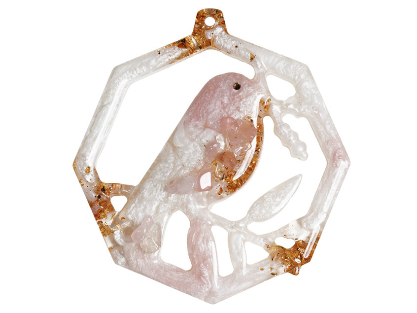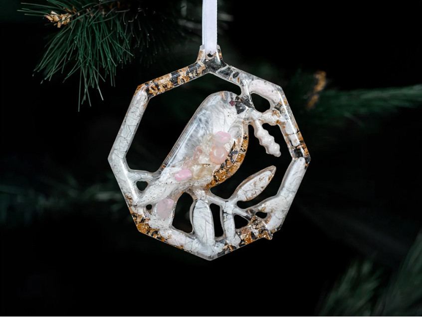 Набор из 3-х елочных игрушек: в форме оленя, снегиря и елки. Игрушки выполнены из ювелирной эпоксидной смолы и украшены галтовкой из натуральных минералов.