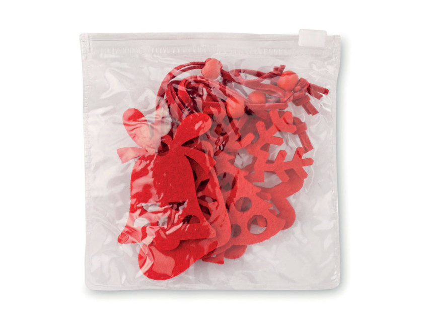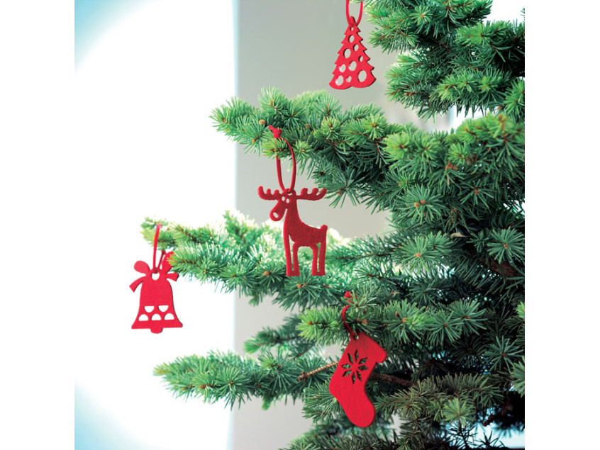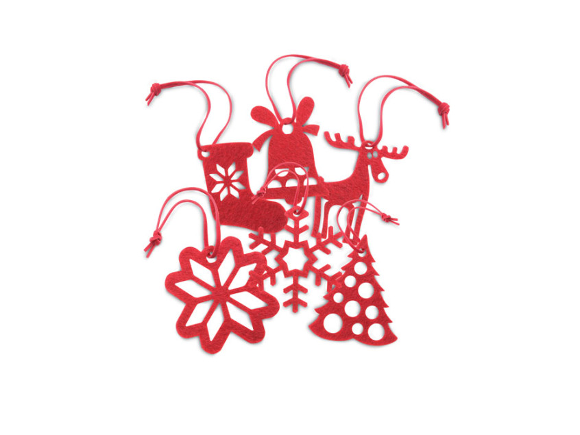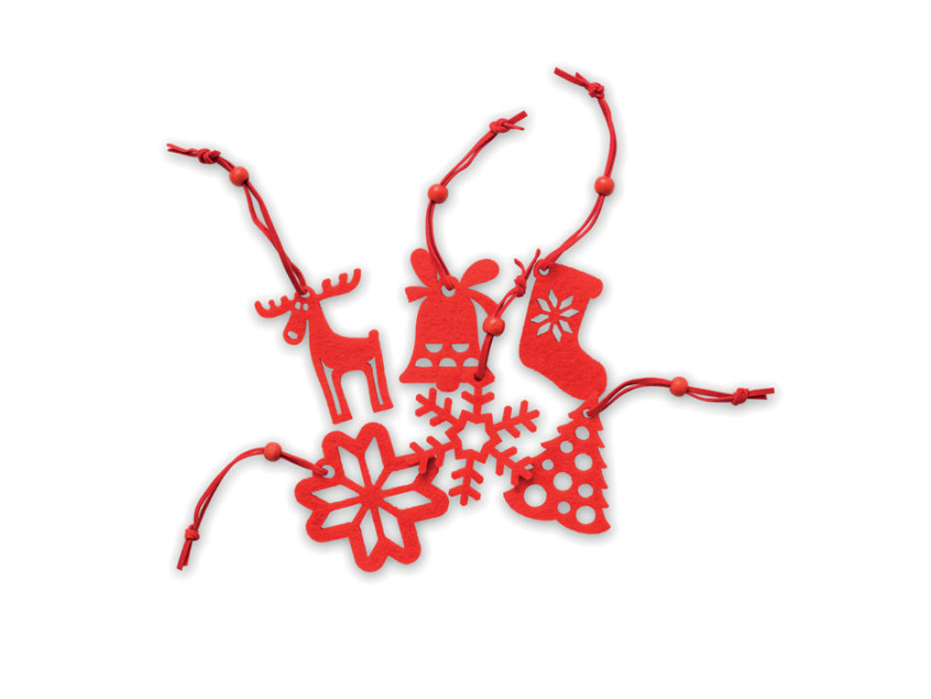 Набор из 6 фетровых новогодних подвесок: елочка, снежинка, сапожок, колокольчик, цветок и олень.