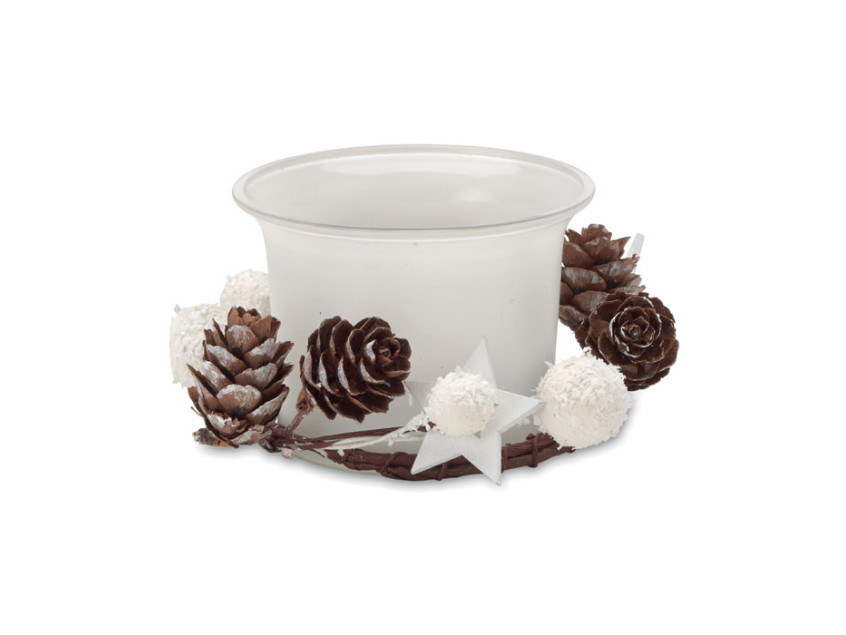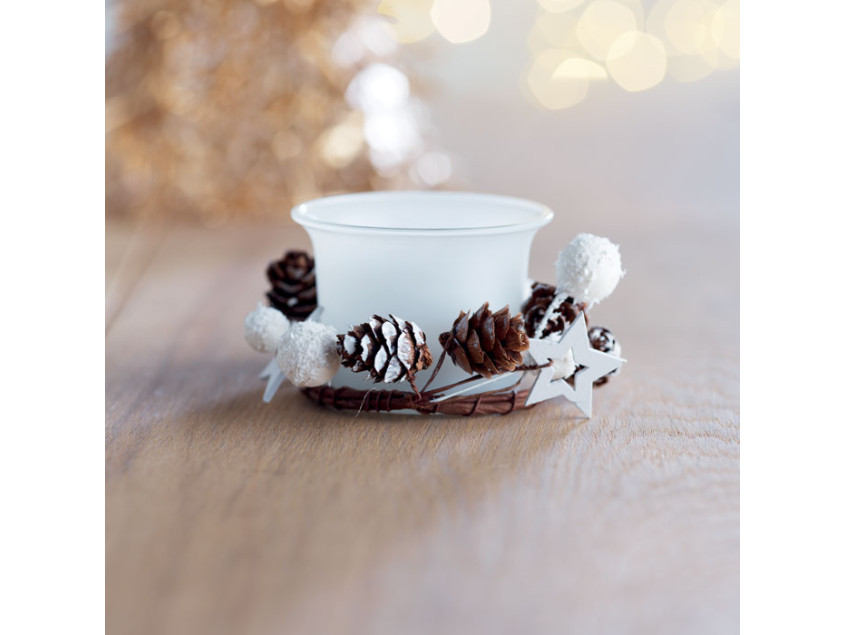 Стеклянный подсвечник с украшением. Представлен в картонной коробке и коробке из ПВХ с ленточкой и открыткой.