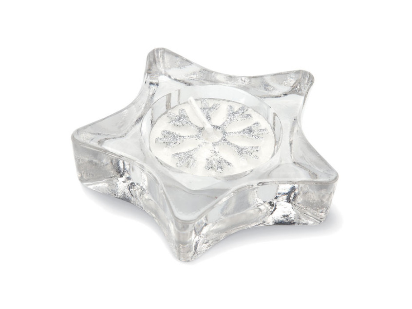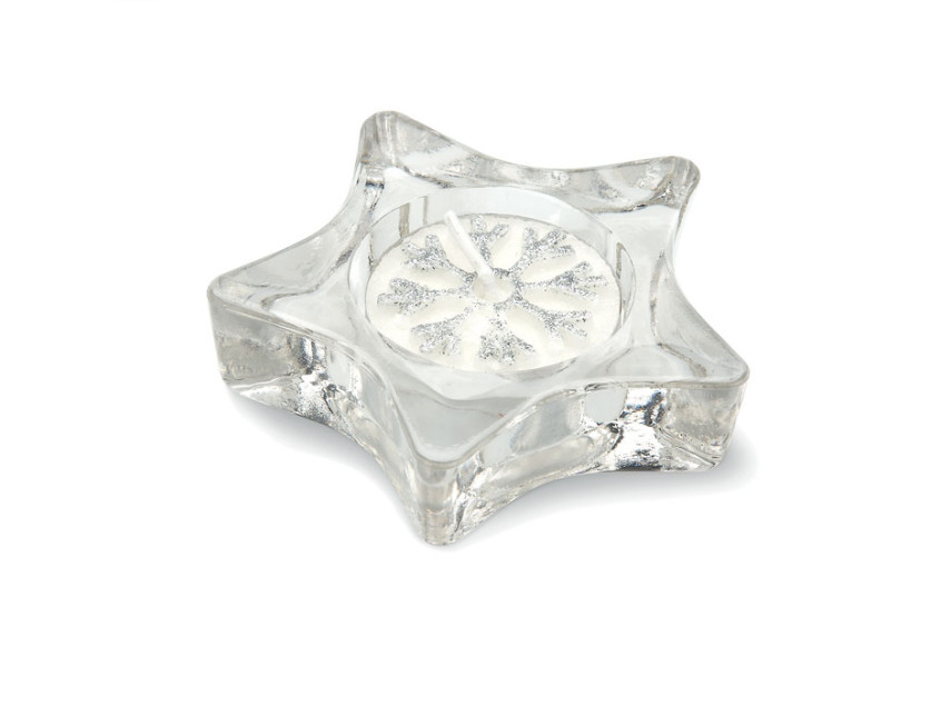 Стеклянный подсвечник со свечой в форме звезды в подарочной серебряной коробочке с прозрачной крышкой и декоративной ленточкой.