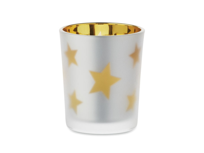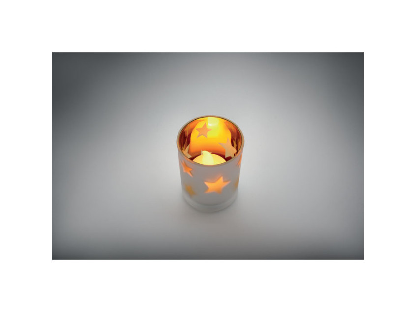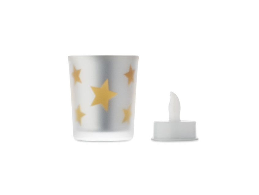 LED tea light in PP candle in glass jar. 1 button cell CR2032 battery included.
