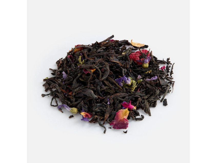 Насыщенный черный чай гармонично сочетается с бархатистой сладостью сушеной вишни и нежной кислинкой сублимированной малины. Лепестки роз и цветки мальвы добавляют напитку изысканные цветочные ноты, создающие ощущение летнего сада.