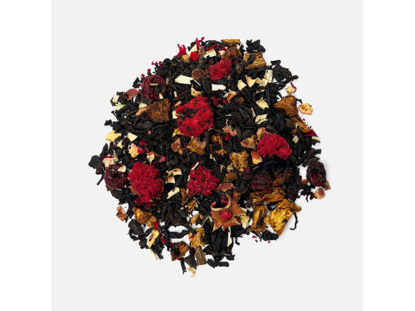 Черный крупнолистовой чай с кусочками ананаса, вишни, лемонграссом, цветками и коркой граната обладает многогранной палитрой вкуса и аромата. В состав чая входят только натуральные ингредиенты, а чайные листья предварительно вымачиваются в соке ананаса: вкус напитка становится особо насыщенным и обогащенным.