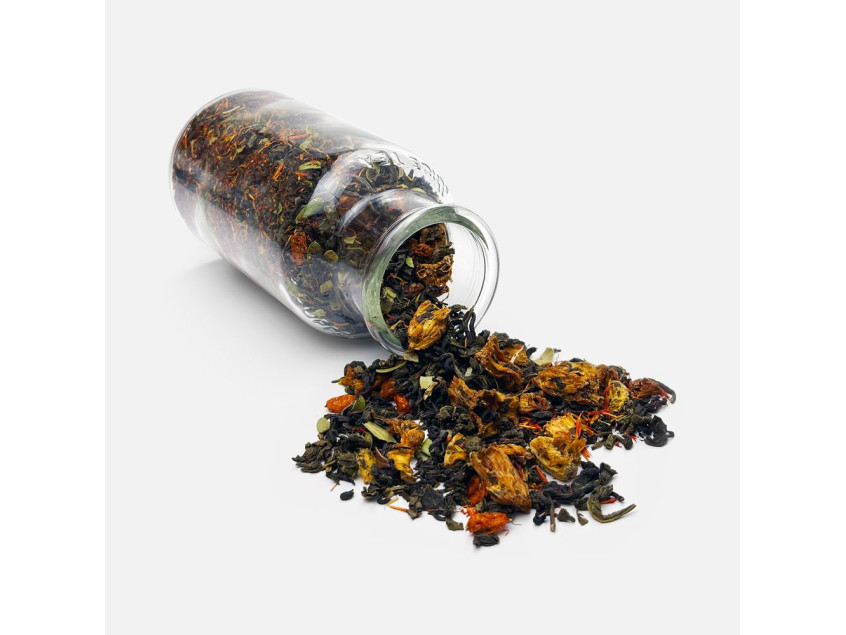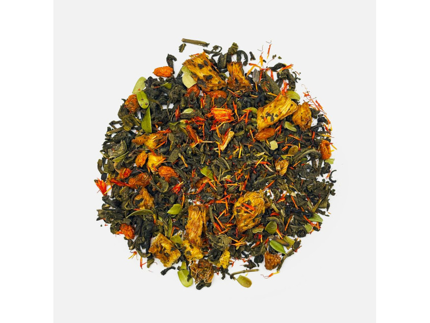 Состав: чай зеленый с ананасом и соком ананаса (чай зеленый байховый крупнолистовой, кусочки ананаса, сок ананаса), цветки сафлора, толокнянка, облепиха сублимированная, ароматизатор натуральный Персик, ароматизатор натуральный Груша.