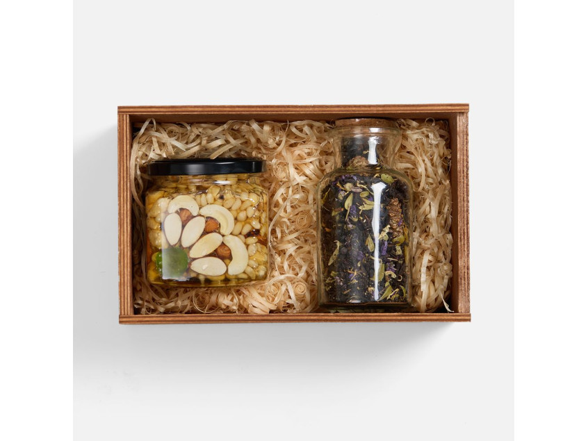 В наборе собраны дары сибирской природы: ароматный медовый десерт с хрустящими орехами, цукатами и семенами и травяной чай «Сила Сибири». В основе чая — крепкий черный чай с лесными травами, ягодами и хвойными нотами, создающими гармоничный вкус со сладковатым послевкусием. Все упаковано в аккуратный деревянный ящик — такой набор станет практичным подарком или приятным дополнением к вечернему чаепитию для тех, кто любит натуральные вкусы и атмосферу уюта.