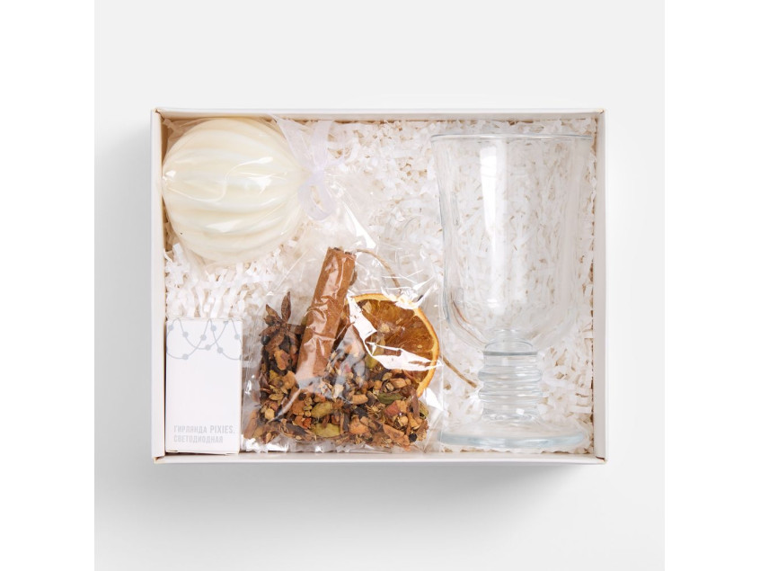 Помимо компонентов для приготовления любимого зимнего напитка здесь представлены главные новогодние атрибуты — для атмосферного оформления и праздничного настроения. Мягкий свет свечи и теплое мерцание гирлянды сделают вечер незабываемым!