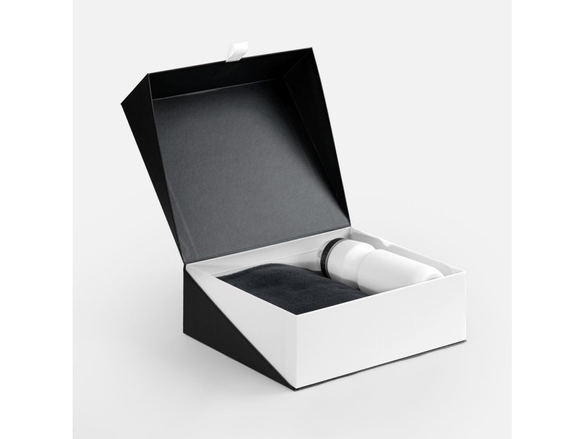 Коробка изготовлена из переплетного картона. Внутренний короб каширован мелованной бумагой с ламинацией, внешний корпус — лайнером из металлизированной бумаги Magestic цвета «Антрацит», плотностью 120 г/м². Крышка фиксируется на магнит.