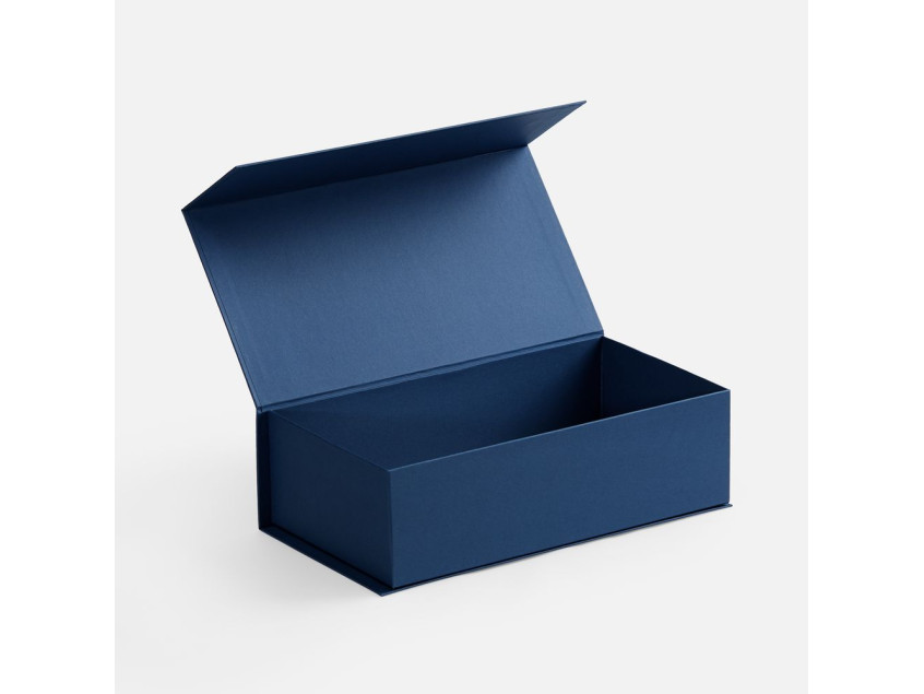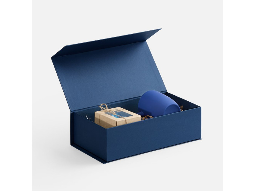 Коробка изготовлена из переплетного картона, кашированного гладкой дизайнерской бумагой Malmero «Благородный синий», с крышкой на магните.