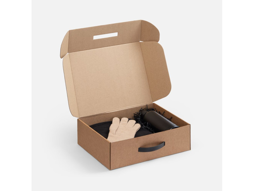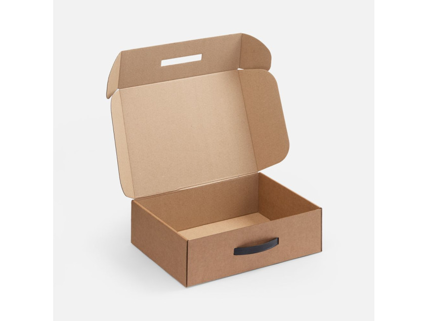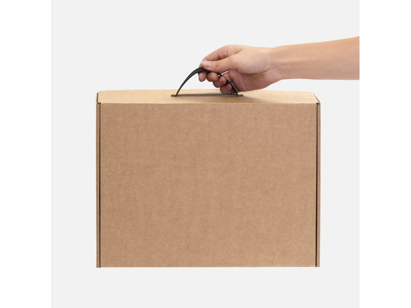 Самосборная коробка-шкатулка со вставной пластиковой ручкой.