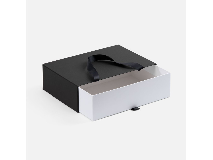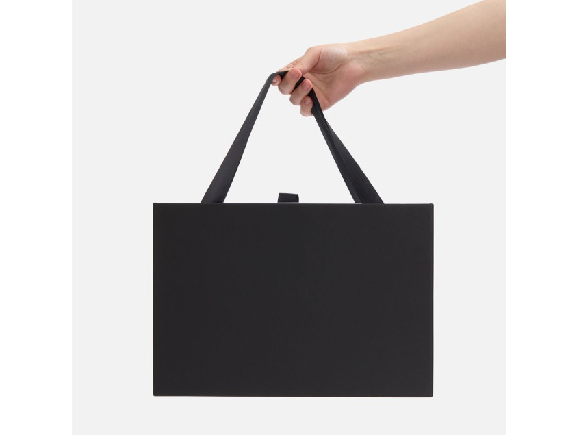 Внешний короб каширован дизайнерской бумаги и оснащен прочными ручками из репсовой ленты. Внутренний короб отделан белой бумагой, ламинированной матовой пленкой.