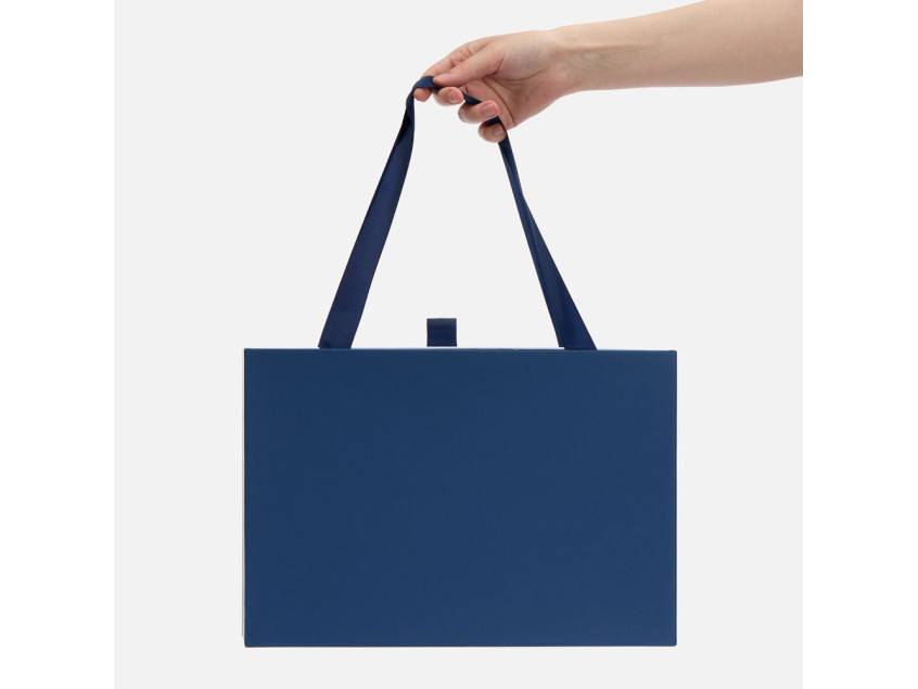 Внешний короб каширован дизайнерской бумаги и оснащен прочными ручками из репсовой ленты. Внутренний короб отделан белой бумагой, ламинированной матовой пленкой.