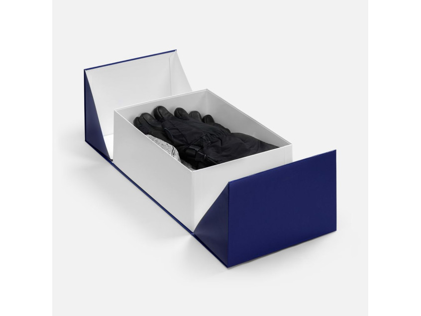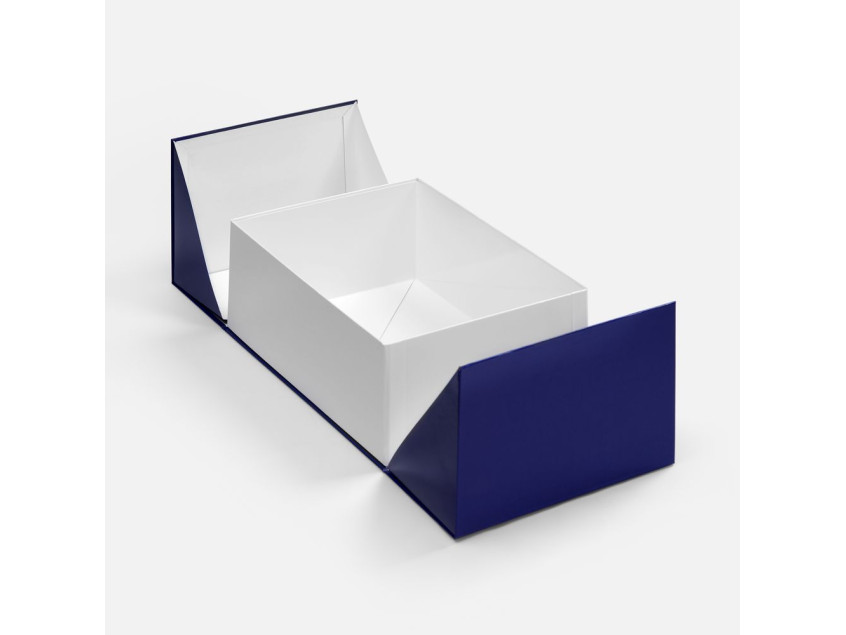 Коробка из переплетного картона 2 мм с оригинальной конструкцией: две симметричные створки открываются, создавая эффектную презентацию содержимого. Складная система на предустановленный двусторонний скотч делает сборку коробки быстрой и интуитивно понятной.
