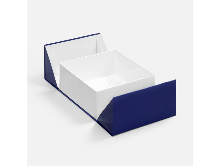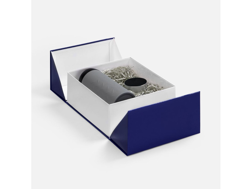 Коробка из переплетного картона 2 мм с оригинальной конструкцией: две симметричные створки открываются, создавая эффектную презентацию содержимого. Складная система на предустановленный двусторонний скотч делает сборку коробки быстрой и интуитивно понятной.