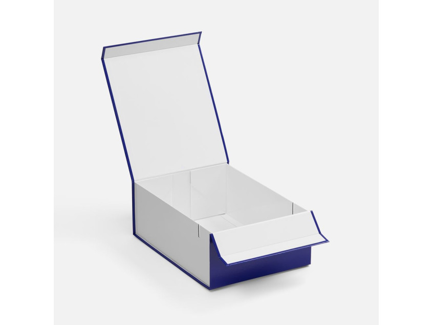 Плотная коробка из переплетного картона толщиной 2 мм с практичной конструкцией на двух створках. Складная система с уже нанесенным двусторонним скотчем позволяет быстро собрать коробку без дополнительных инструментов. Лайнер с полуглянцевым ламинированием устойчив к повреждениям и надолго сохраняет безупречный вид.