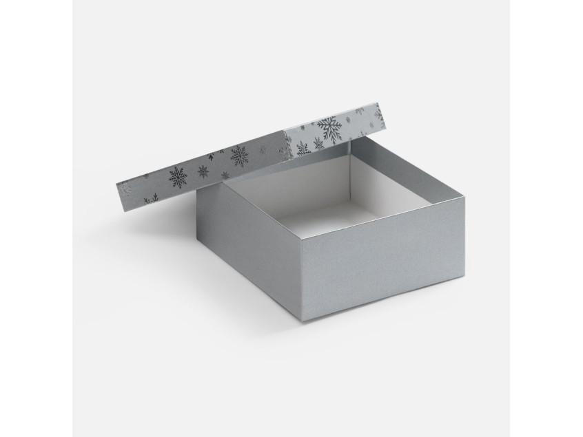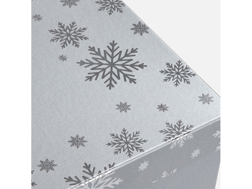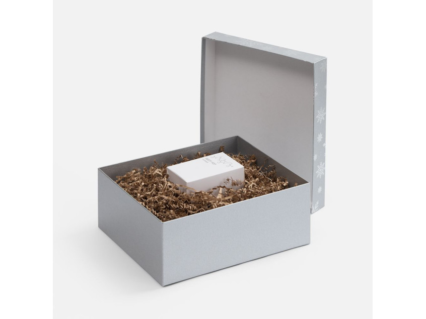 Коробка выполнена из переплетного картона толщиной 1,5 мм, кашированного бумагой TPG с тиснением серебристой фольгой.