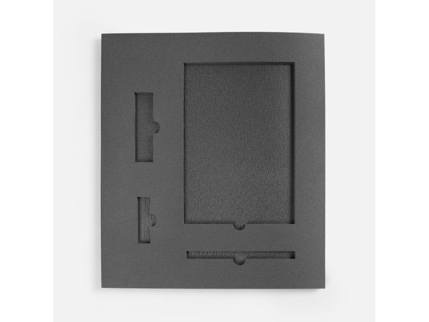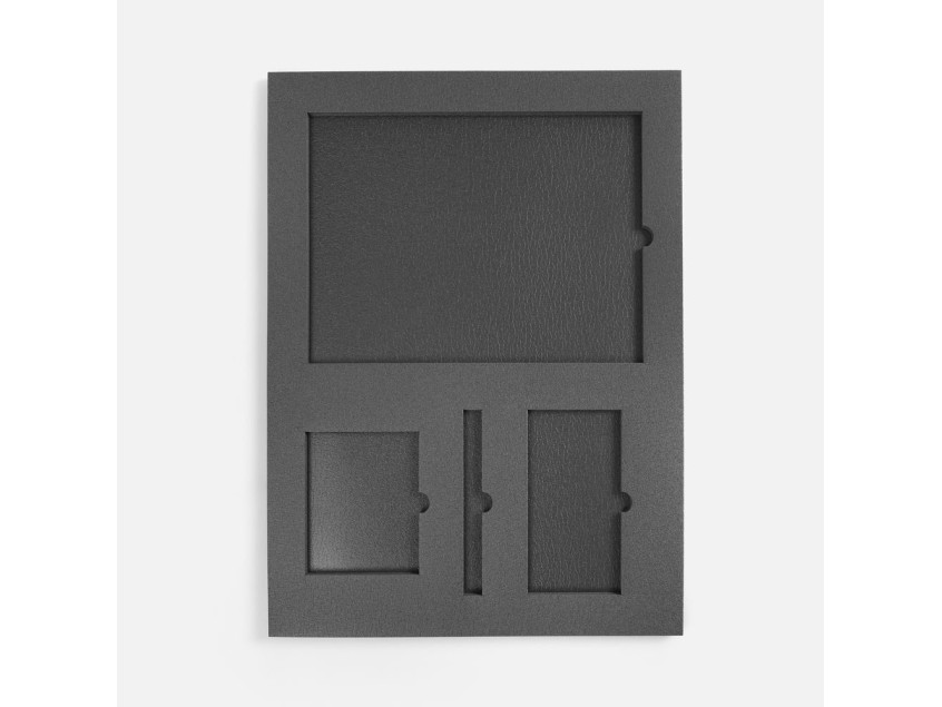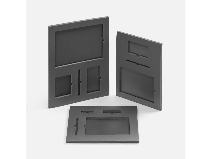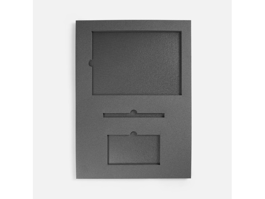 Ложемент, изготовленный из материала Izolon 500 черного цвета, представляет собой многослойную конструкцию, состоящую из нижнего слоя толщиной 5 мм и верхнего слоя толщиной 10 мм. В соответствии с утвержденным макетом, проемы для размещения предметов могут быть спроектированы как в одном, так и в обоих слоях.