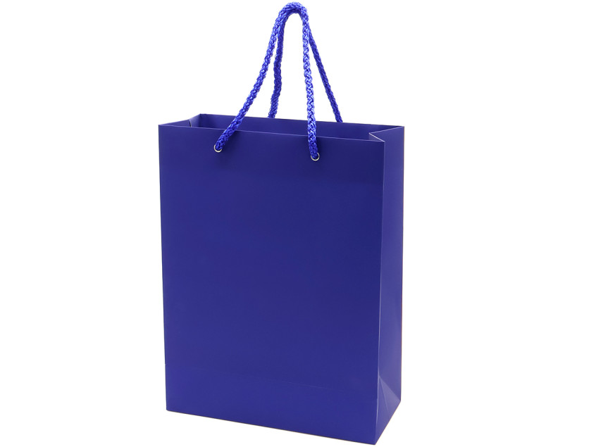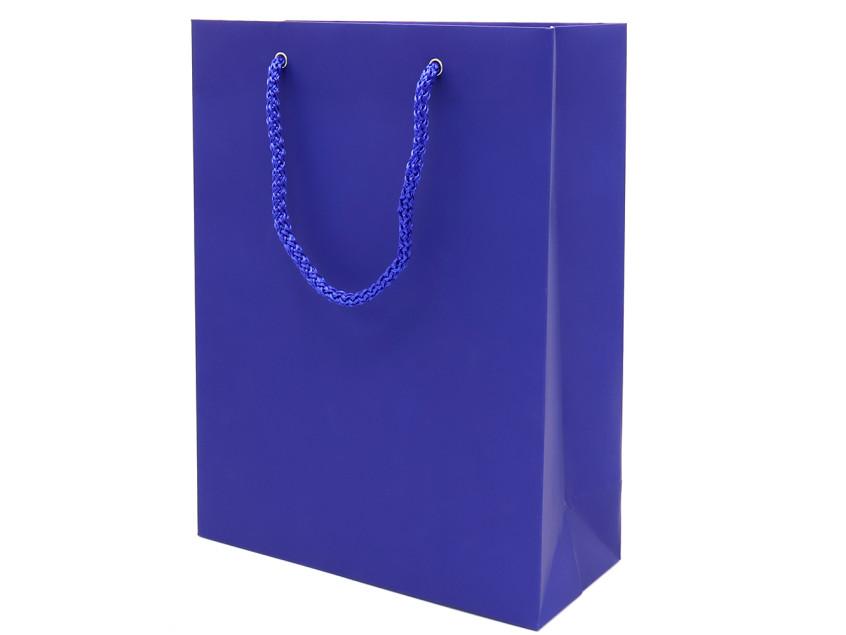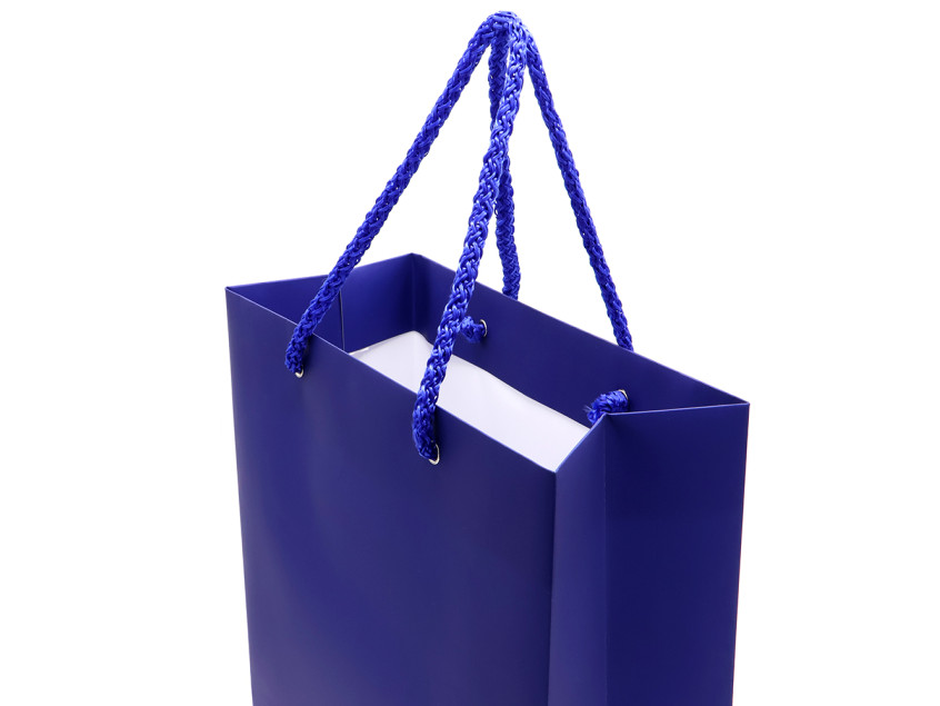 Бумажный пакет плотностью 170 г/м². Покрытие софт-тач. Шнур 6 мм синего цвета. Люверс - серебристый.