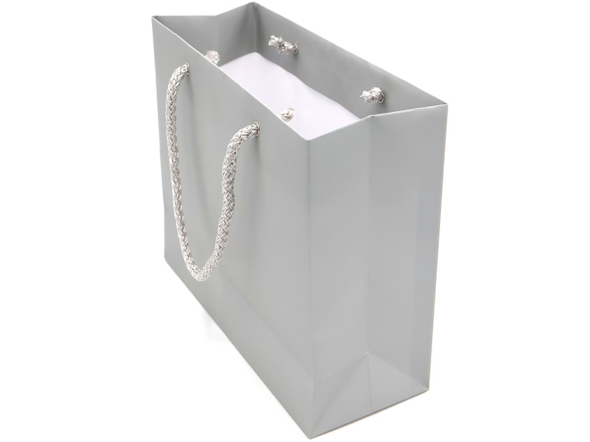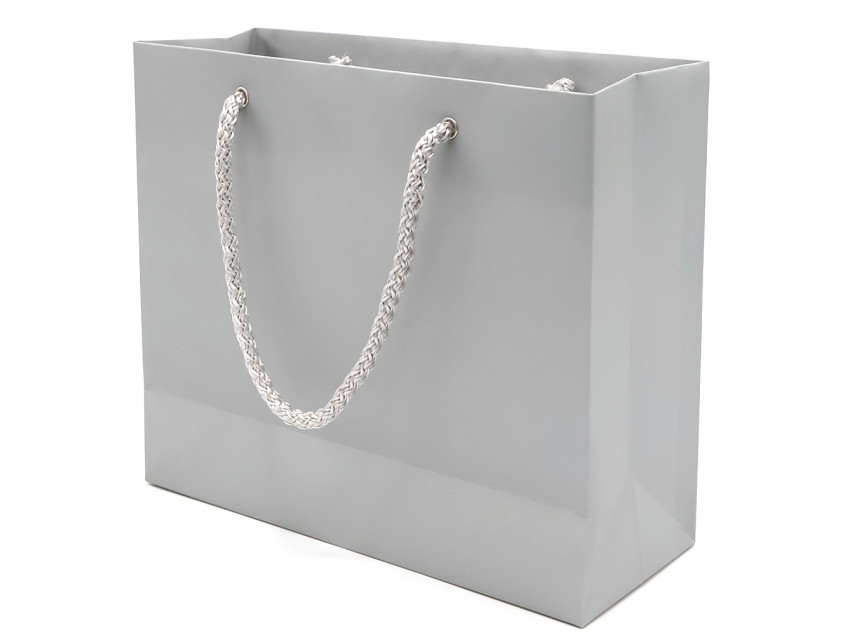 Бумажный цветной пакет плотностью 170 г/м². Покрытие софт-тач. Шнур 6 мм серого цвета. Люверс - серебристый.