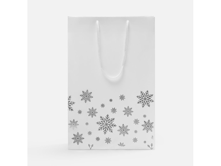Пакет из бумаги плотностью 120 г/м²с покрытием софт-тач и тиснением серебристой фольгой.Выдерживает вес до 2 кг.
