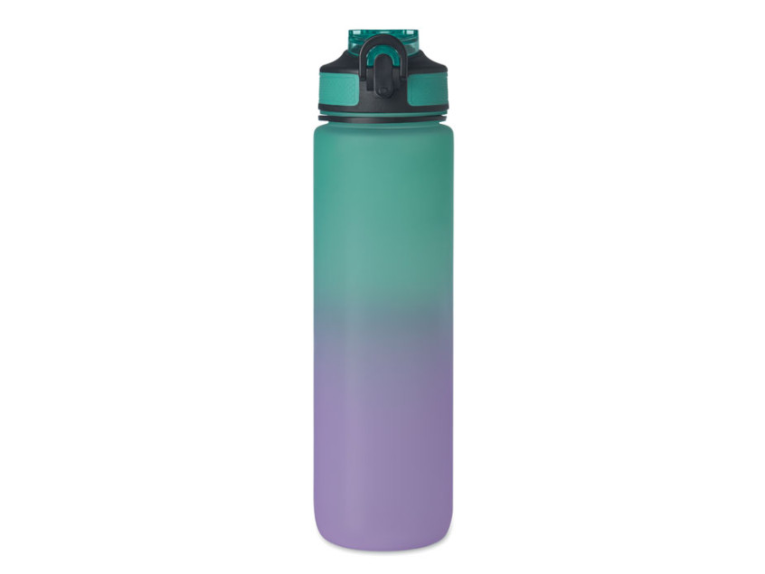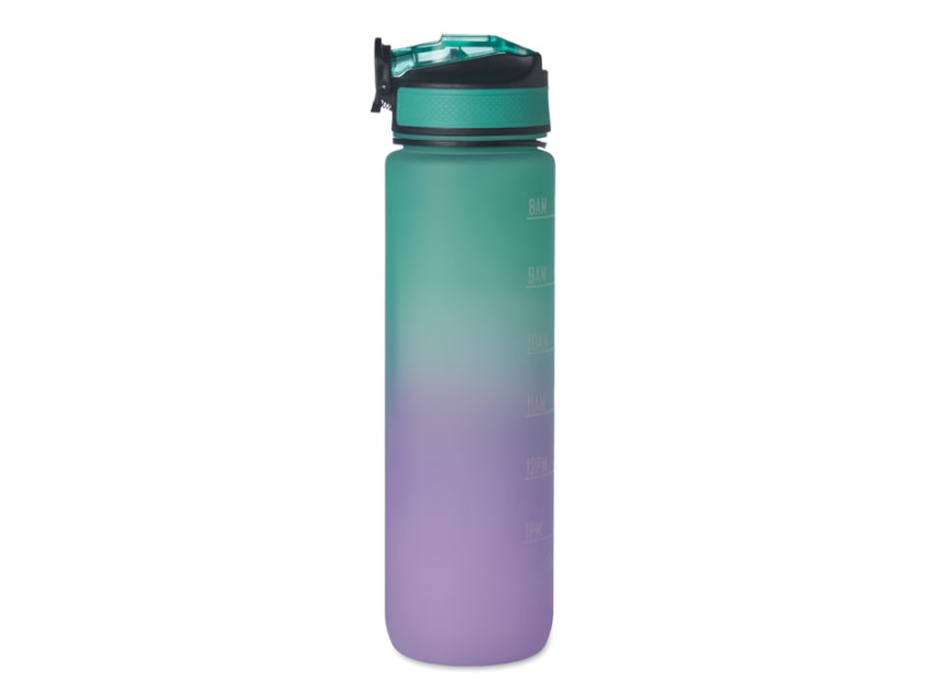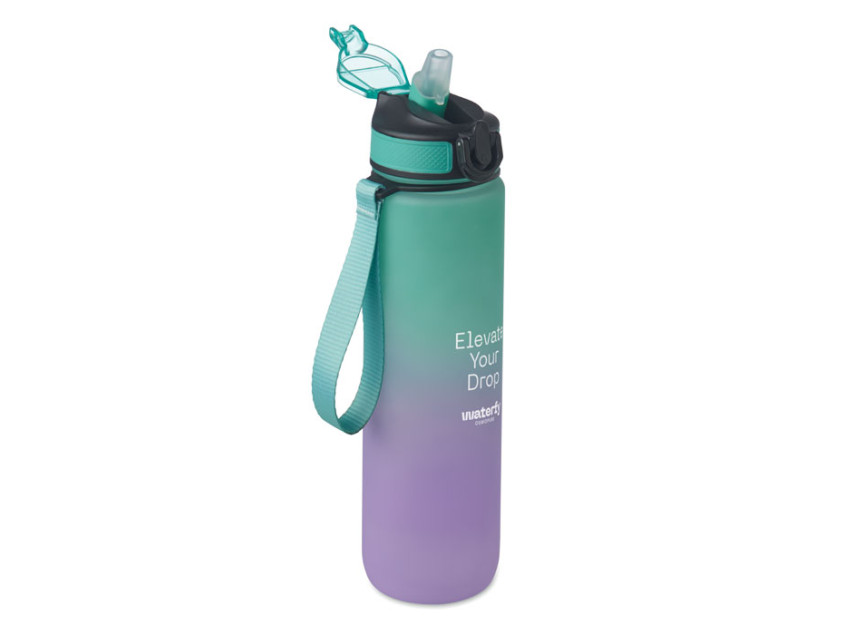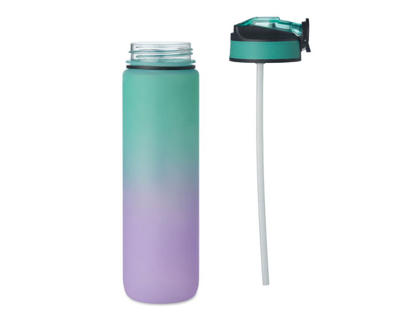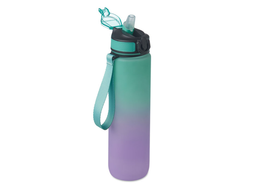 Спортивная бутылка для воды из переработанного пластика со встроенной соломинкой для питья, мягким силиконовым горлышком, разметкой, регулирующей потребление жидкости, удобной крышкой с замком безопасности и ремнем для переноски. Объем 1 л.