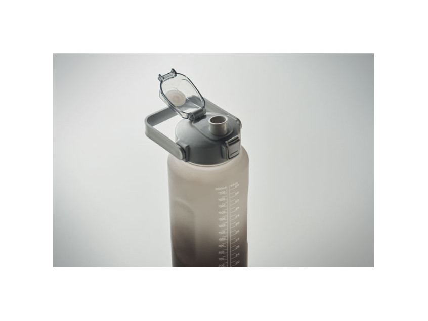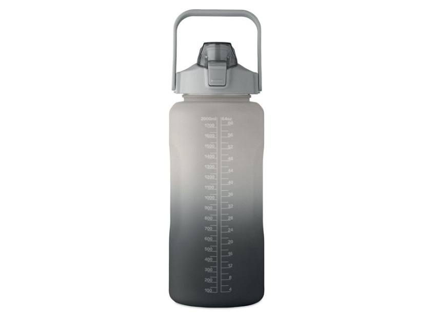 Бутылка для воды из переработанного пластика. Имеет откидную крышку, открывающуюся одной рукой, соломинку для питья, предохранительный замок и ручку. Герметичная. Вместимость: 2000 мл.