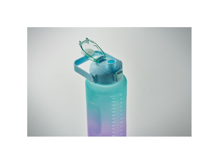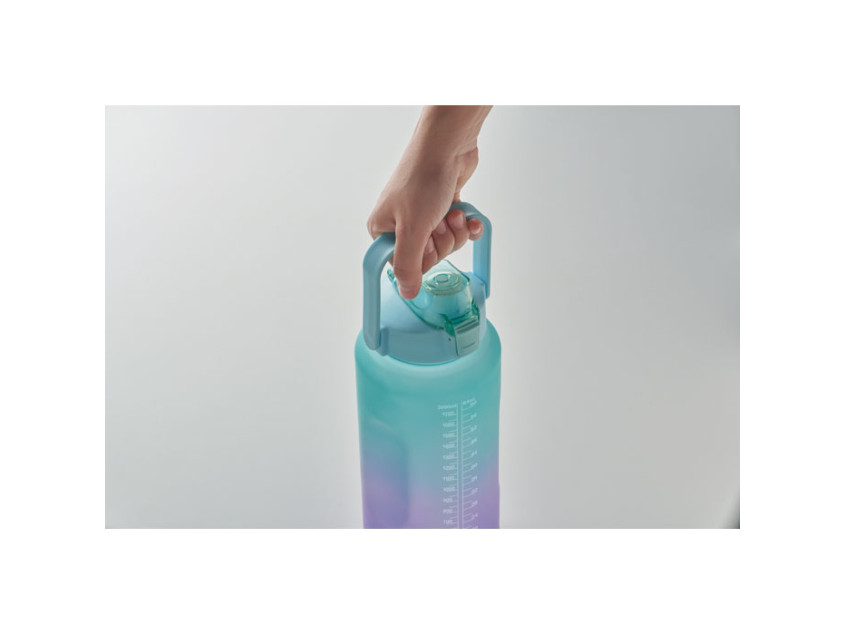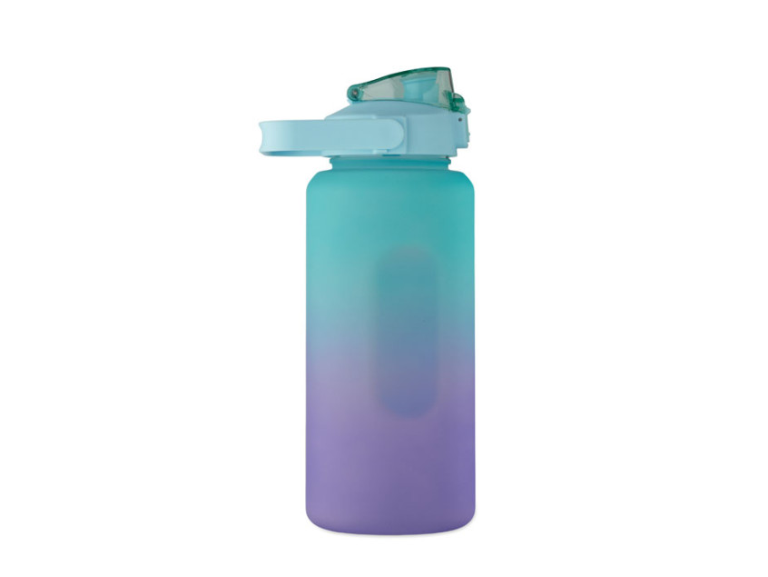 Бутылка для воды из переработанного пластика. Имеет откидную крышку, открывающуюся одной рукой, соломинку для питья, предохранительный замок и ручку. Герметичная. Вместимость: 2000 мл.