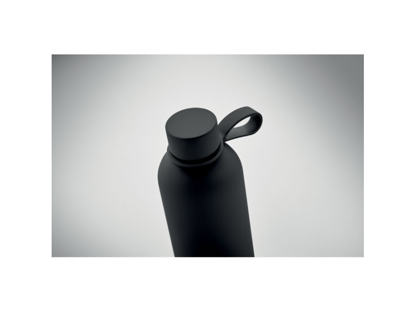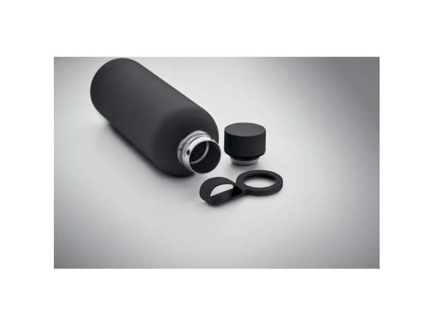 Бутылка объемом 500 мл создана для тех, кто ценит качество и долговечность. Ее корпус выполнен из переработанной нержавеющей стали (90%) с добавлением обычной нержавеющей стали (10%), что делает ее не только прочной, но и экологически ответственной. Резиновое покрытие обеспечивает приятное тактильное ощущение и защищает бутылку от царапин, а силиконовый ремешок добавляет удобства при переноске.