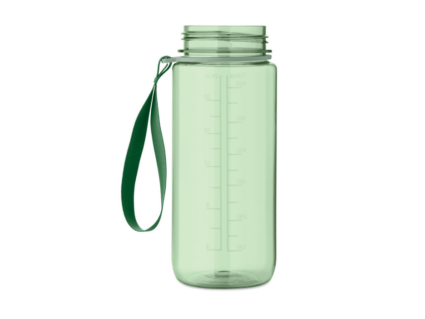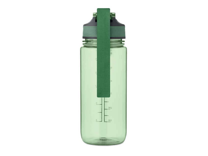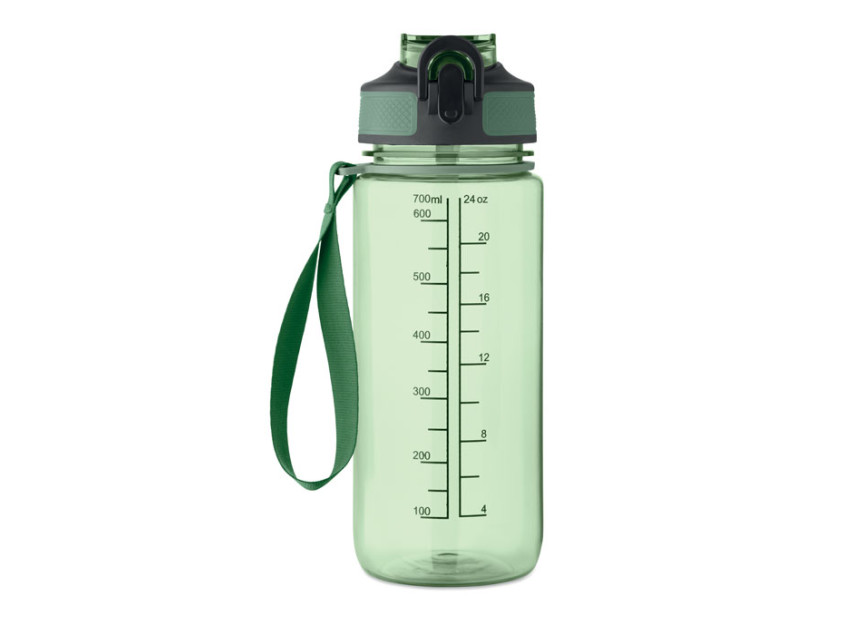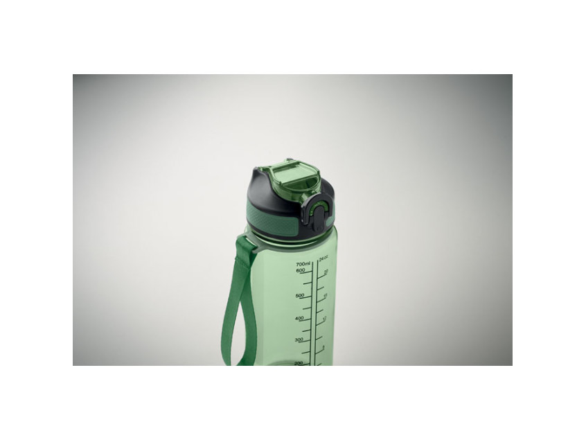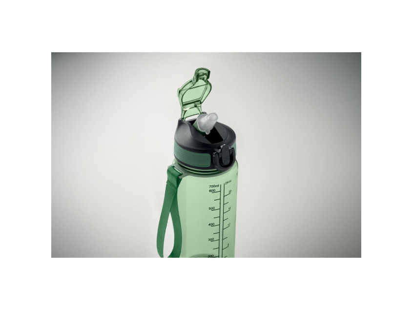 Спортивная бутылка для воды из RPET со встроенной трубочкой, откидной крышкой, открывающейся одной рукой, предохранительным замком и ремешком для переноски из RPET. Объем 700 мл. Герметичная.