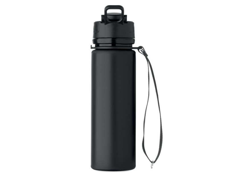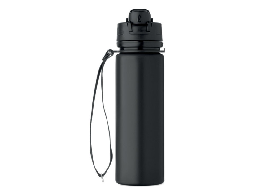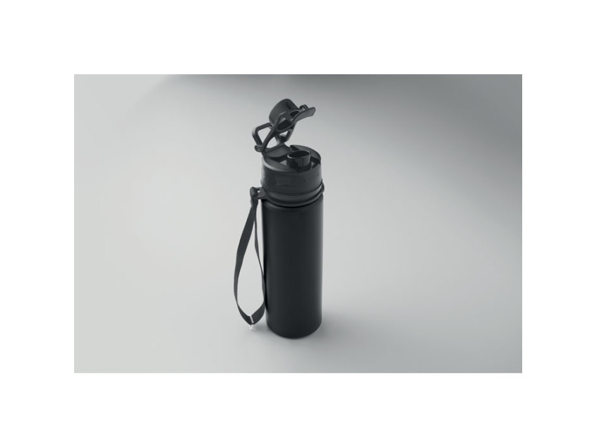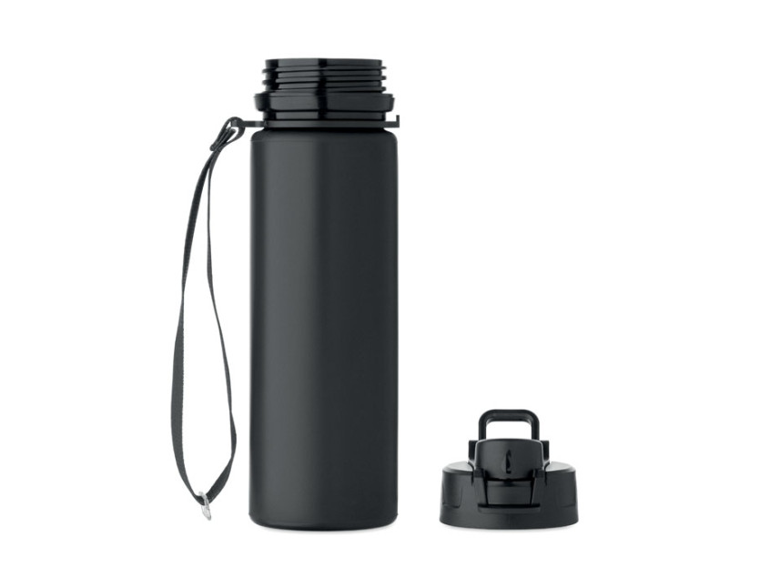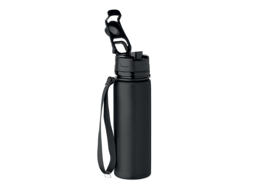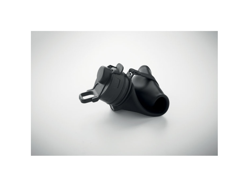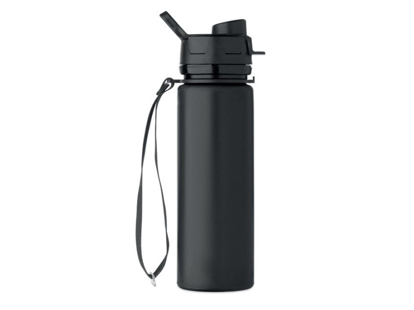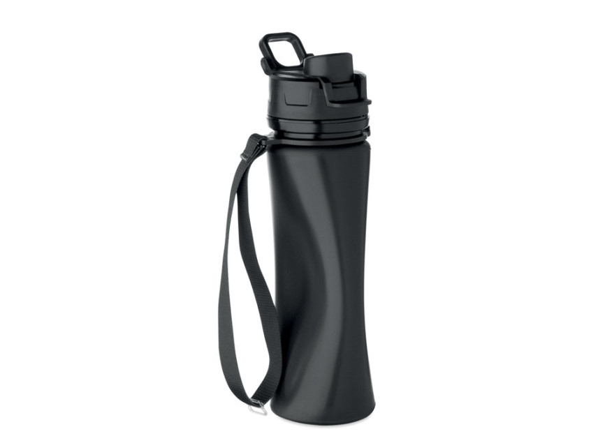 Складная силиконовая спортивная бутылка с крышкой из полипропилена (PP), ручкой, полиэстеровым ремешком и прозрачной застежкой для фиксации в сложенном виде. Герметичная. Объём: 500 мл.