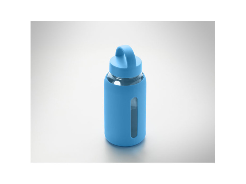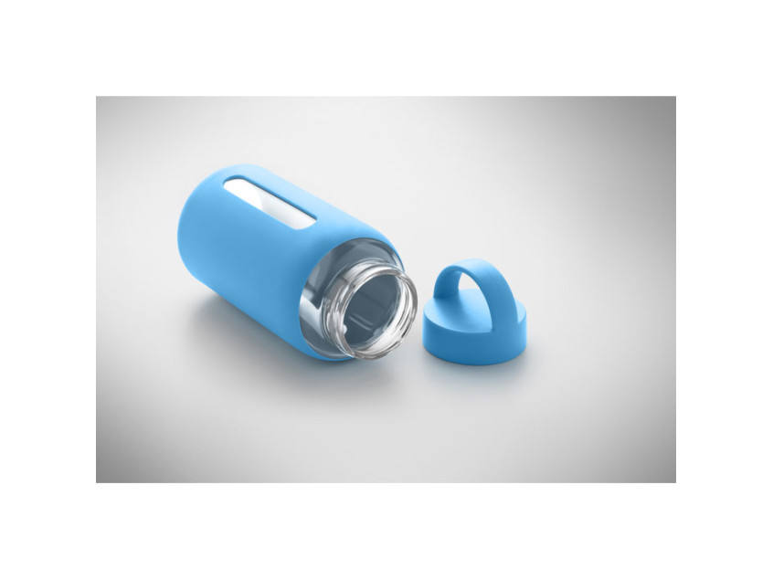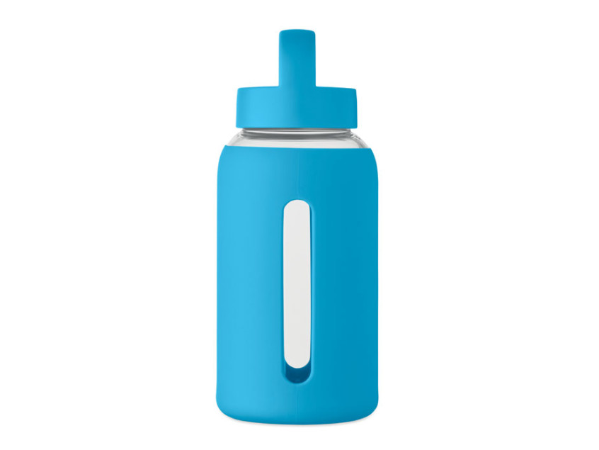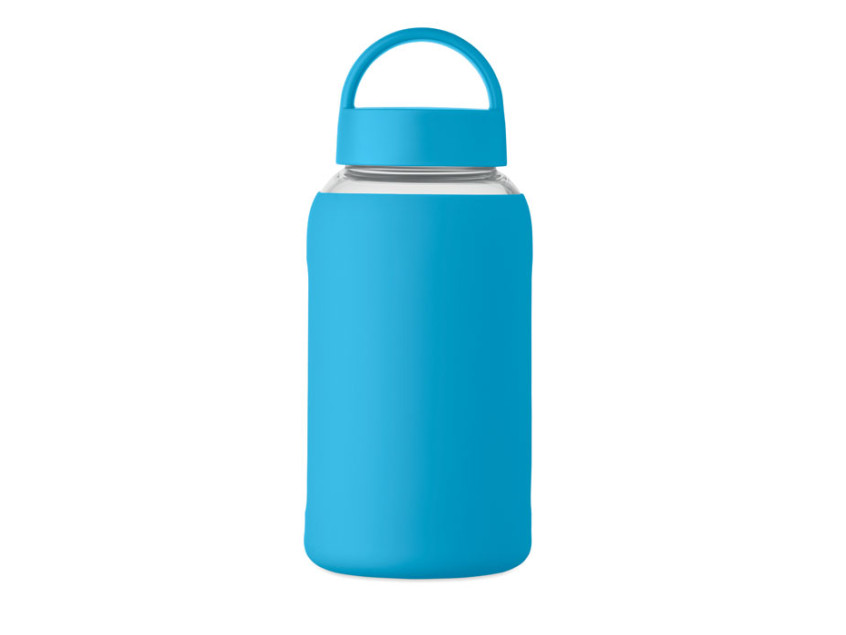 Бутылка из прочного боросиликатного стекла с силиконовым чехлом и крышкой с ручкой. Объем: 600 мл.
